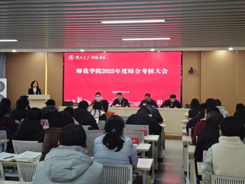 1月7日,学院在正言厅召开2025年度综合考核会议暨2026年首次全院教职工大会,学校综合考核组出席会议,全院教职工参会,院党委书记卢轶婷主持会议。
